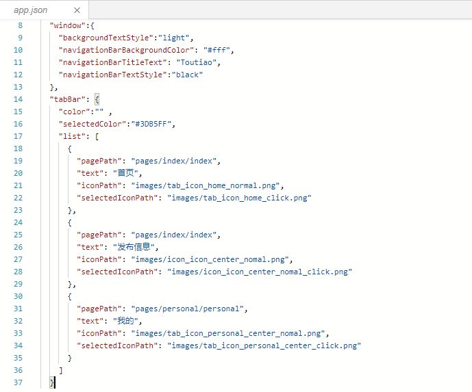 小程序要實現這個底部導航其實很簡單,我們只要在根目錄下的app.json文件中配置: