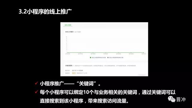 小程序推廣——關鍵詞。每個小程序可以綁定10個與業務相關的關鍵詞,通過關鍵詞可以直接搜索到該小程序,帶來搜索訪問流量。