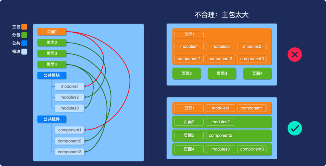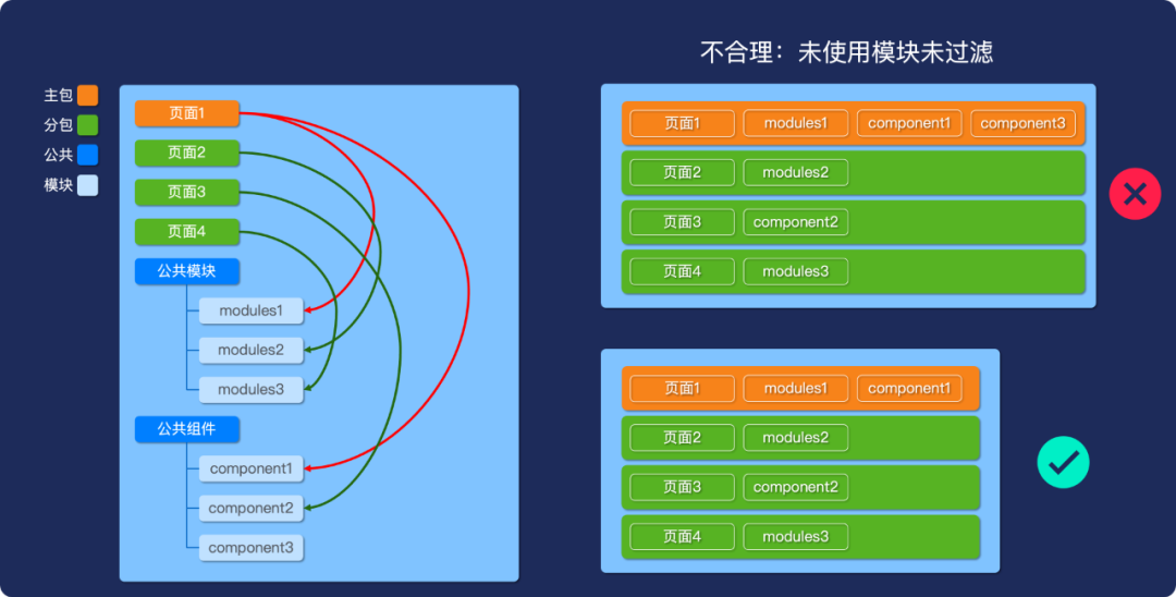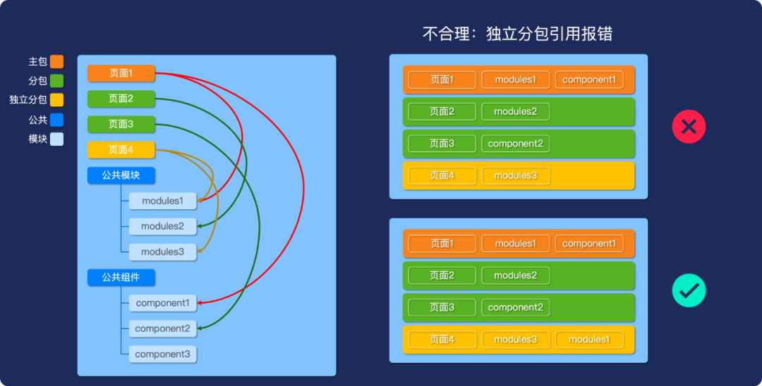 另外,如果某一個分包與主包引用了同一個模塊,這時候將這個模塊計算到主包中是 OK 的,但如果這個分包是一個獨立分包的情況下,再去引用主包的模塊,是有可能報錯的。上面這種情況需要通過構建的方式將模塊復制一份放到獨立分包下面才能保證小程序的正確執行。