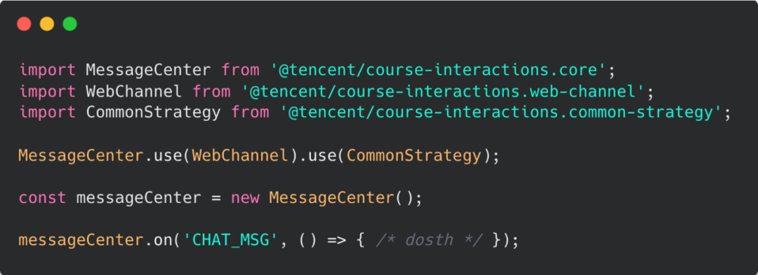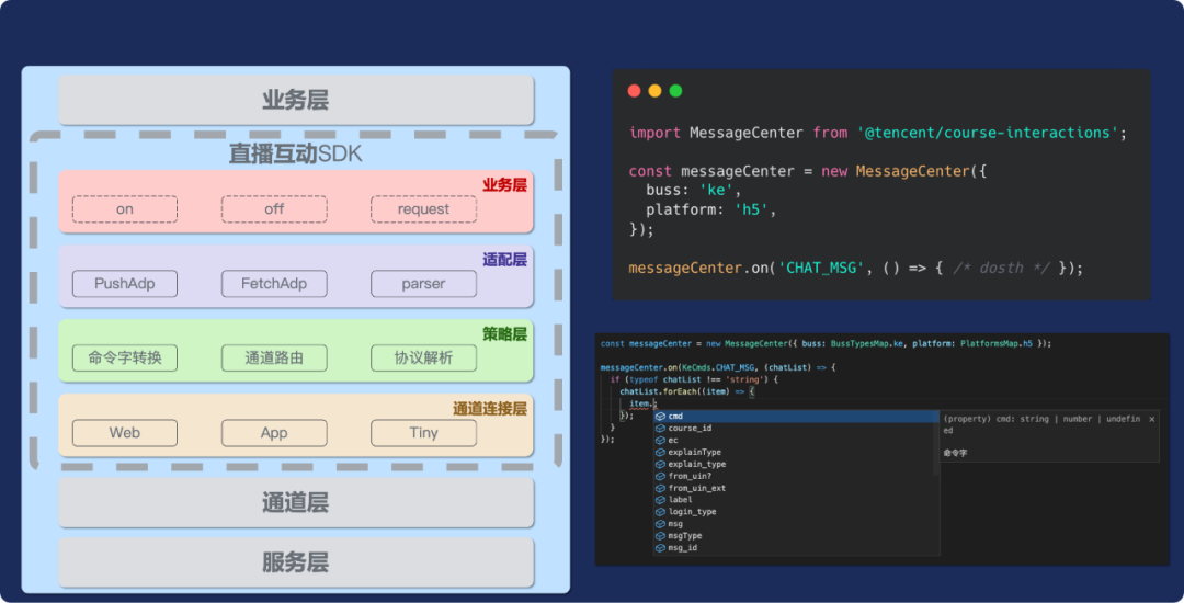 為了讓這個核心能力能夠達到跨端跨業務的復用效果,我們團隊開發了一個直播互動的 SDK,對外拋出簡單的 API,內部設計了接口層、適配層、通道層、策略層,結構非常清晰,使用起來也很方便,初始化后開發只需要監聽或請求對應的命令字即可,無需關心內部的轉化,并且能夠利用 ts 的類型推斷能力直接拿到通道返回的數據類型。