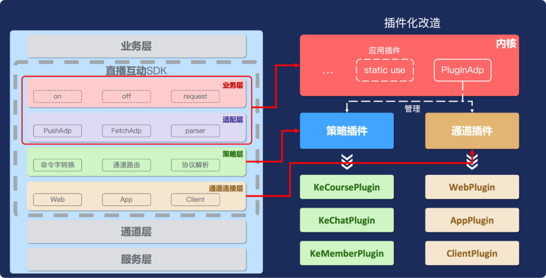 我們改造的方案是進行插件化處理,將接入層(業務層)和適配層作為 SDK 的內核抽離出來,并添加了 pluginAdaptor 對插件進行適配管理,將策略層和通道連接層的邏輯進行抽象處理,制訂好對應的規范,根據抽象類和業務需求實現對應的策略插件和通道插件。