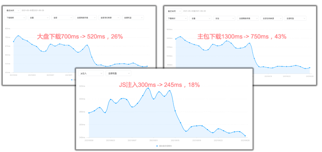 我們的優化在實際的啟動耗時上也有比較顯著的效果,主包下載耗時優化了 43%,js 的注入耗時優化了 18%。
