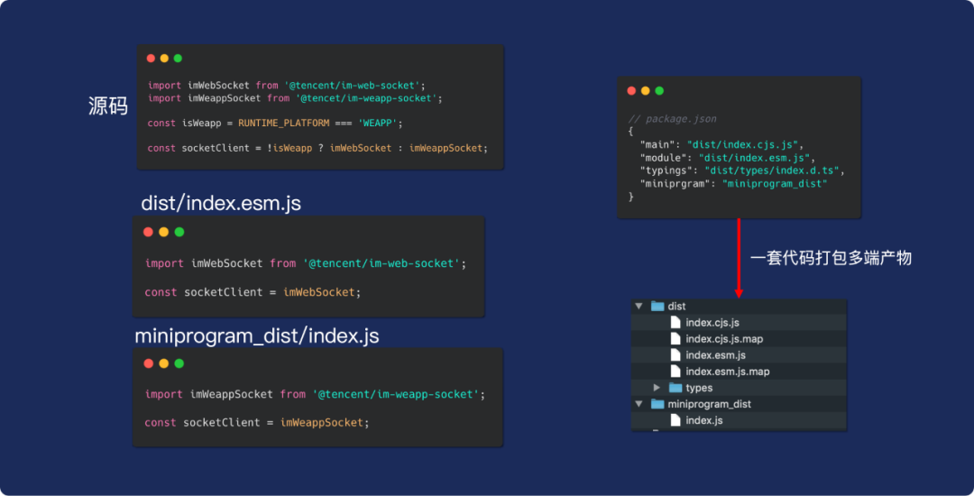 兼容性上通過 rollup 打包,在構建時注入不同的環境變量,輸出對應端所需要用到的 bundle。