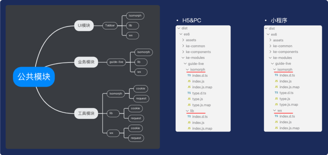 在開發階段通過路徑別名來統一引用路徑,例如小程序的項目中設置tsconfig.json的paths為"ke-modules/*": "submodules/ke-modules/*/wx",這樣就可以統一業務層面的代碼邏輯。在構建階段submodule會通過ts單獨編譯成js,如果是h5和PC的項目就只會將isomorph和lib目錄構建到產物中,小程序的項目就只將isomorph和wx目錄構建到產物中。