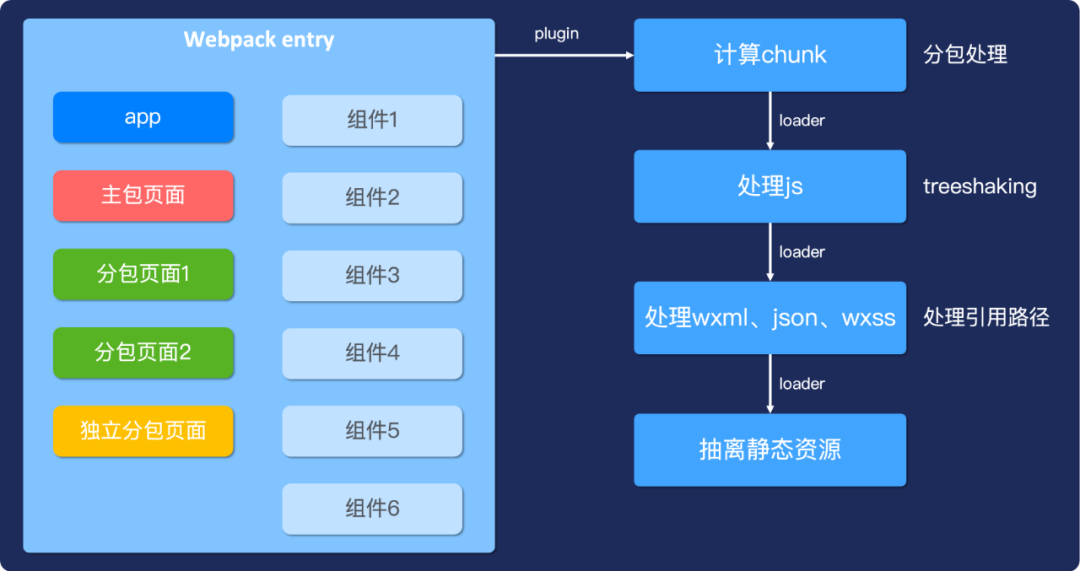 以 app.js 作為入口文件,根據小程序的配置規則找到對應的 json 文件,逐層遞歸就可以將整個小程序所使用到的頁面和組件分析出來,并將所有的頁面和組件都作為 webpack 的 entry,就可以獲取到小程序中 js 模塊的引用信息了。