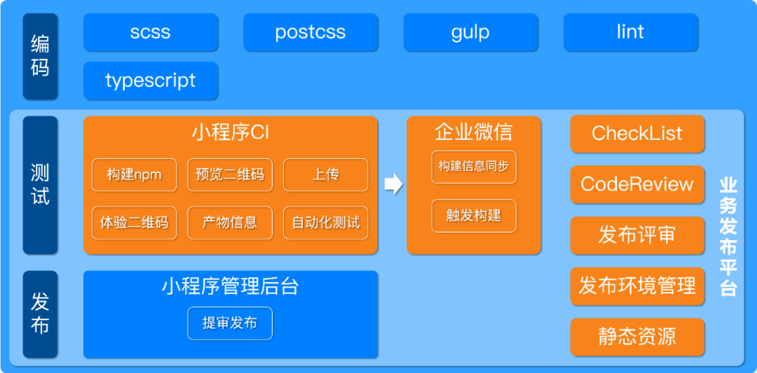 為了解決發布流程不規范的問題,我們將小程序的發布也接入到了業務發布平臺。在發布平臺上進行 CheckList、CodeReview、發布評審、發布環境管理、發布靜態資源等流程的流轉,確保需求發布的質量、合規和有序。