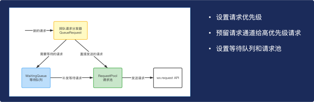 為了優化弱網情況下存在的隱患,我們對請求隊列進行了優化,通過設置請求池與等待隊列,并劫持 wx.request,在發送請求時對請求的 url 進行優先級排序,將業務請求設置為高優先級的請求,上報請求的優先級降低。當請求通道相對緊張時會將高優先級的請求優先發送,低優先級的請求在請求通道空閑時再進行補發。