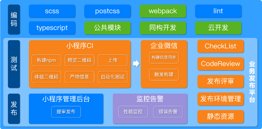 首先是開發階段,我們想要形成一個可以稱之為爽的開發體驗,并不僅僅是指 coding 階段,還需要覆蓋到測試以及發布階段: