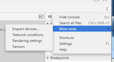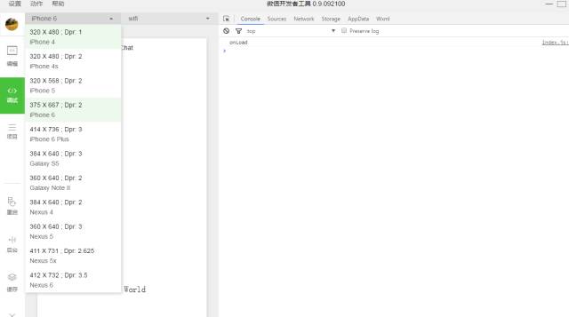 點擊調試按鈕,左上有可以選擇調試的移動終端,里面可以選擇蘋果,三星及其他不同分辨率設備。設備右邊有選擇網絡的按鈕,可以選擇wifi,2G,3G,4G網絡。在右邊的窗口,有console可以查看控制臺打印的信息,以及網絡,存儲信息等。