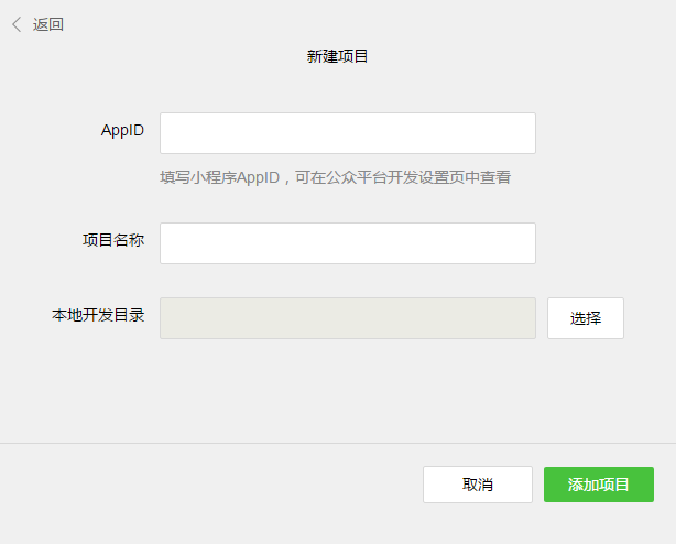 因為我們沒有內測賬號,這個appid可以隨便輸入,項目名稱,及開發目錄就隨便寫了。