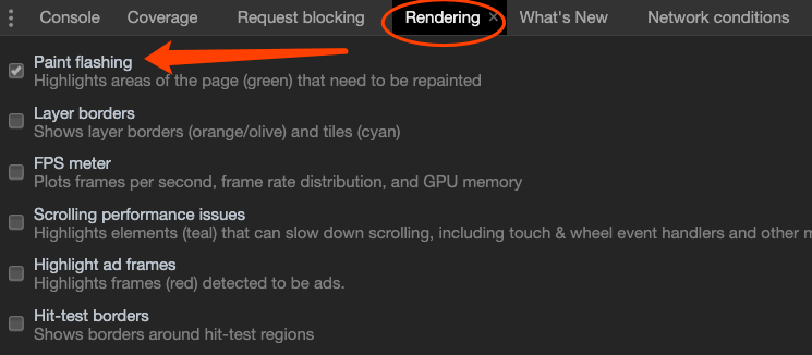 關于重渲對頁面的影響,我們就不多說了。那么如何知道頁面的渲染過程呢?我們可以通過 Rendering 來可視化查看。