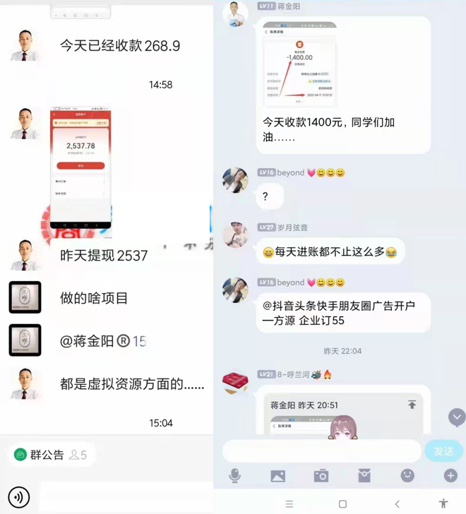 因為沒辦法一對一的教大家,所以我最近建立一個微信訓練營的社群,在社群里面我會定期免費分享適合大部分行業的推廣獲客方法,通過直播的形式現場實操,并且這些方法是公益分享的,無論你做什么行業,操作任何的項目,分享的這些推廣獲客技術都是適用的。目前已經整理了18種方法,比方說知乎推廣、公眾號推廣、問答營銷、抖音推廣、視頻號推廣、閑魚推廣、音頻推廣、百度霸屏、廣告投放、視頻營銷、貼吧營銷等外面絕對學習不到的核心技術,利用這些方法每天搞幾十上百個精準客戶是根本不是問題。對于手上沒有項目的伙伴,我們還有實時更新的最新互聯網項目,比如金礦產品打造. 抖音書單項目.虛擬資源產品.知識付費項目.聯盟推廣項目.閑魚無貨源項目.紅包封面項目.視頻搬運項目.自媒體賺收益項目等等許多落地項目.總用一款適合你,不管是作為主業還是副業,只要認真操作,都能獲得不錯的收益!這是咱們群里其中一些小伙伴操作的結果!有學習完方法推自己項目的,有操作我們提供的項目月入幾萬的比比皆是!