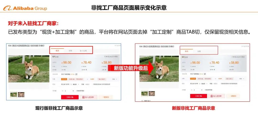 A.商品轉換方案:若商家經營方式以定制為主,可在商家工作臺商品管理中點擊修改詳情,選擇將該商品通過轉換功能轉化為新版定制品,轉化后原商品積累基礎交易數據會同步轉移至新的定制品,且不影響搜索權益;B.商品拆分方案:若商家經營方式上現貨、定制兼顧,可以在商家工作臺商品管理中,點擊修改詳情選擇商品拆分,該商品將被拆分為現貨和定制品2個商品,拆分后原商品積累的基礎交易數據會保留在現貨商品;二、未入駐找工廠商家鑒于平臺已于2021年2月1日下線商家發布非找工廠加工定制商品的功能,針對歷史已發布定制品升級如下:1.商家店鋪已發布類型為現貨+加工定制的商品,平臺將在網站頁面去掉加工定制商品TAB切,僅保留現貨相關信息。(詳見圖示)